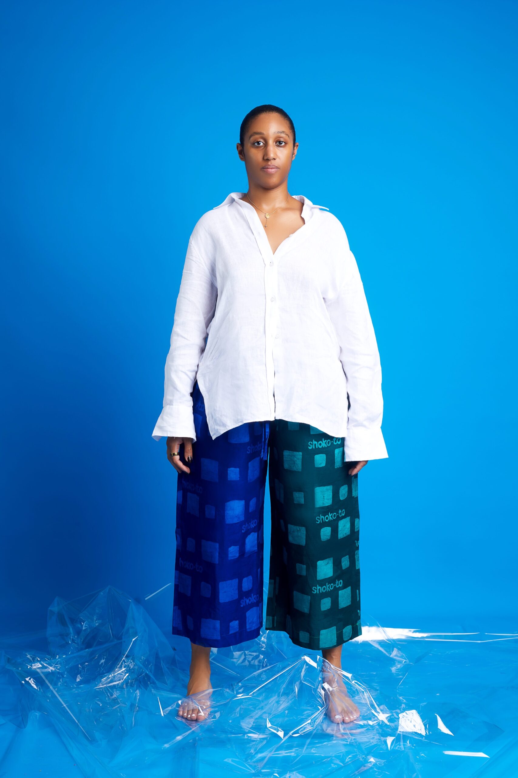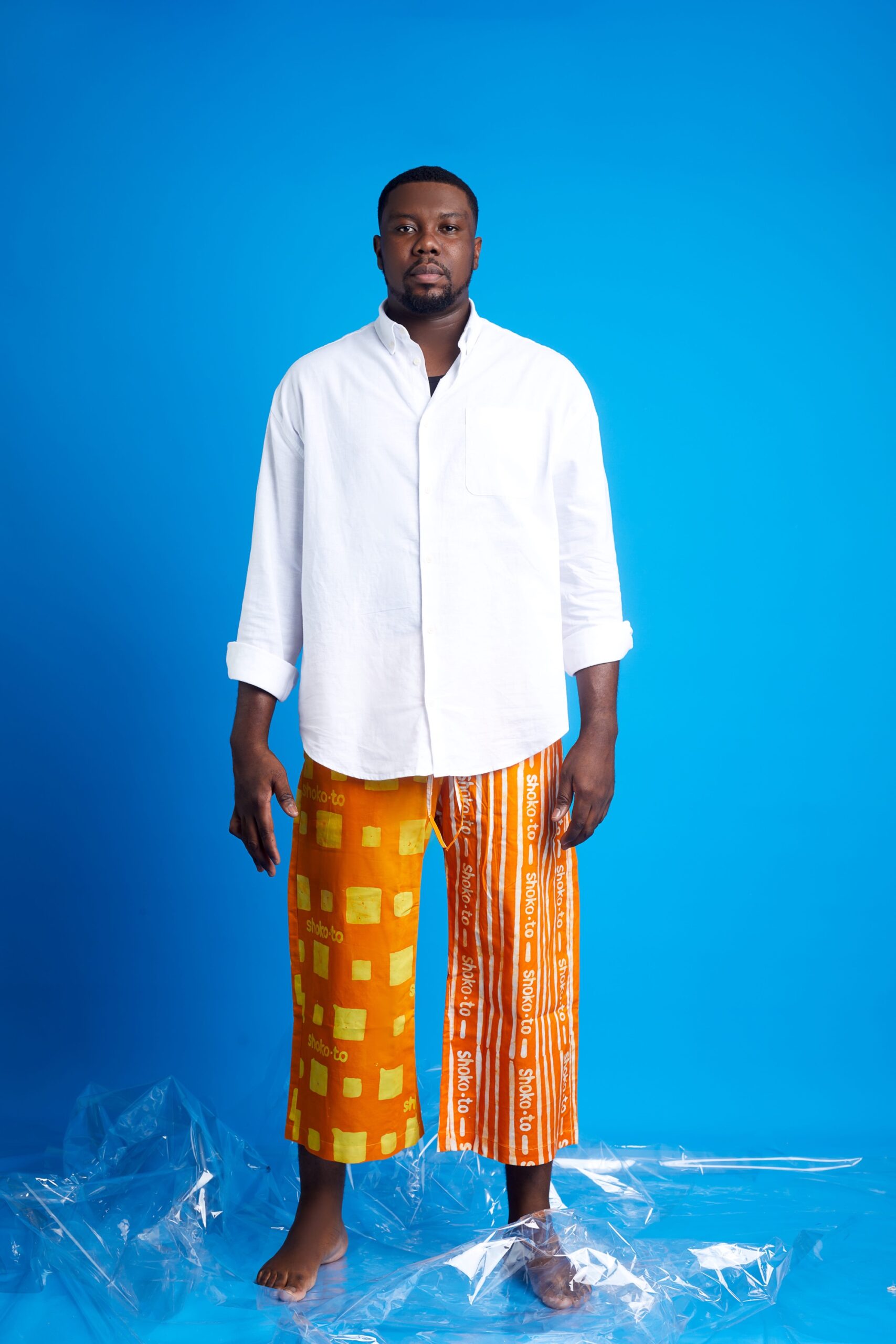 Purple & Blue short trousers with Blue & Purple kente strip & pocket.